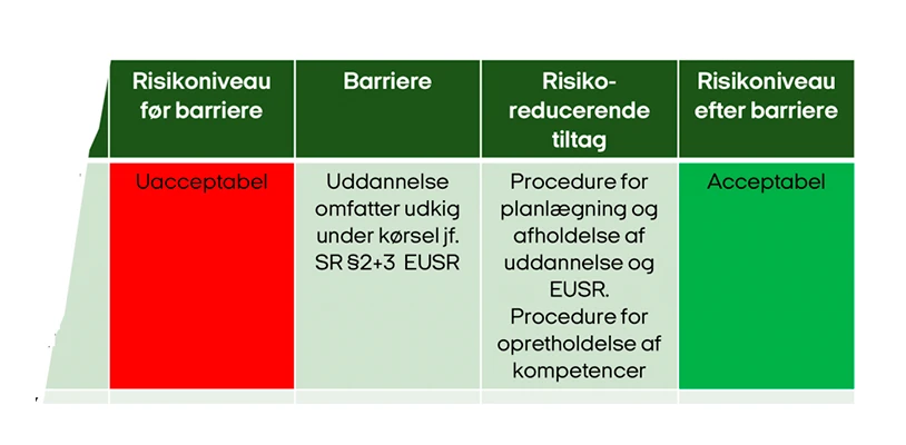 Når I har fulgt fremgangsmåden, vil I kunne pege på hvilke barrierer/tiltag, I kan implementere for at afværge at faren opstår eller mindske konsekvenserne for faren. I skal vurdere risici for hver enkelt fare. Det vil sige, om en risiko er acceptabel eller uacceptabel, og om I skal opstille barrierer for at imødegå disse. I skal altså iværksætte visse forholdsregler, altså barrierer, for at minimere sandsynligheden for at de uacceptable risici bliver til ulykker.