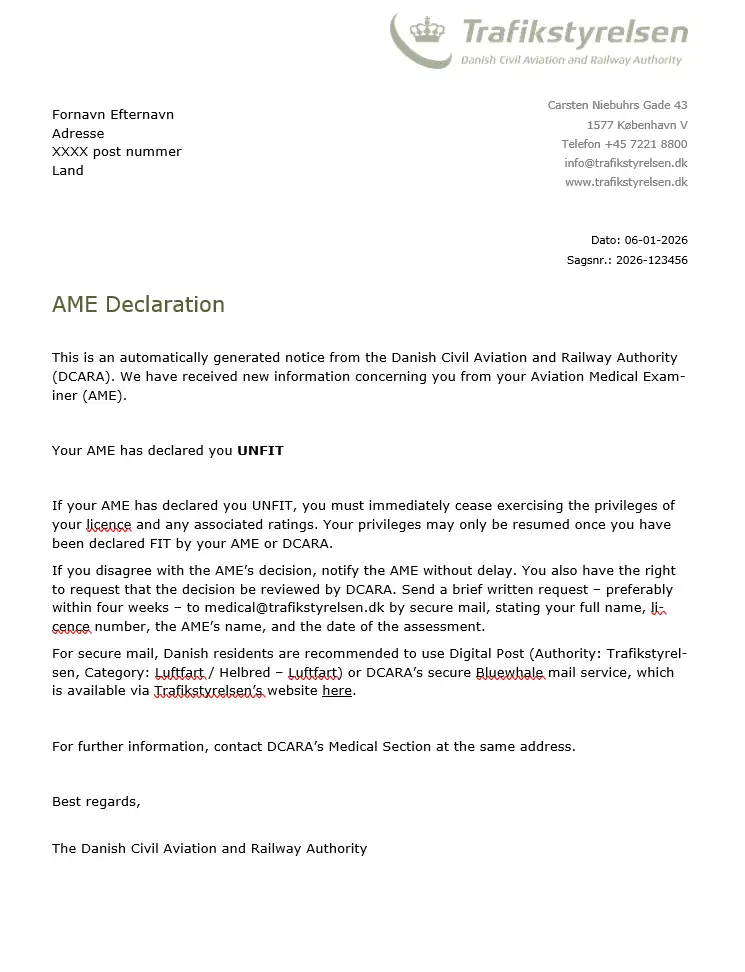 Anvend/upload derfor jeres egne journalnotater, eller brug det opdaterede Assessment Decision-skema, som I kan finde på vores hjemmeside her . En kopi af skemaet kan med fordel også udleveres til ansøger, fx hvis der meldes UNFIT. Så har kommercielle flight crew noget, de kan anvende over for deres arbejdsgiver.