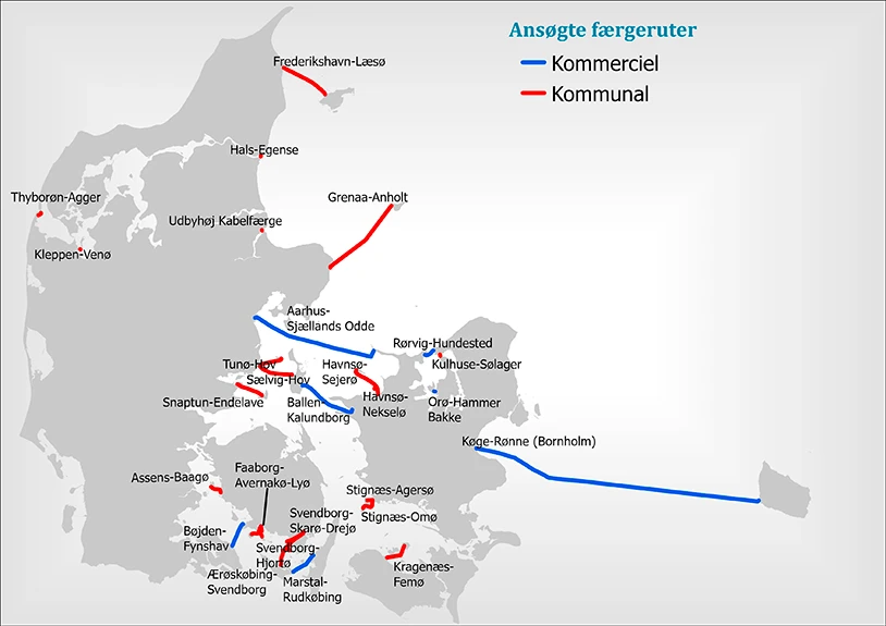 Ved ansøgningsfristens udløb har Trafikstyrelsen modtaget 8 ansøgninger fra kommercielt drevne indenrigsfærger, og 24 ansøgninger fra kommunale færger.