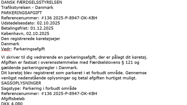 Eksempel på en falsk parkeringsafgift, hvor Trafikstyrelsens eller Færdselsstyrelsens navn er blevet misbrugt.