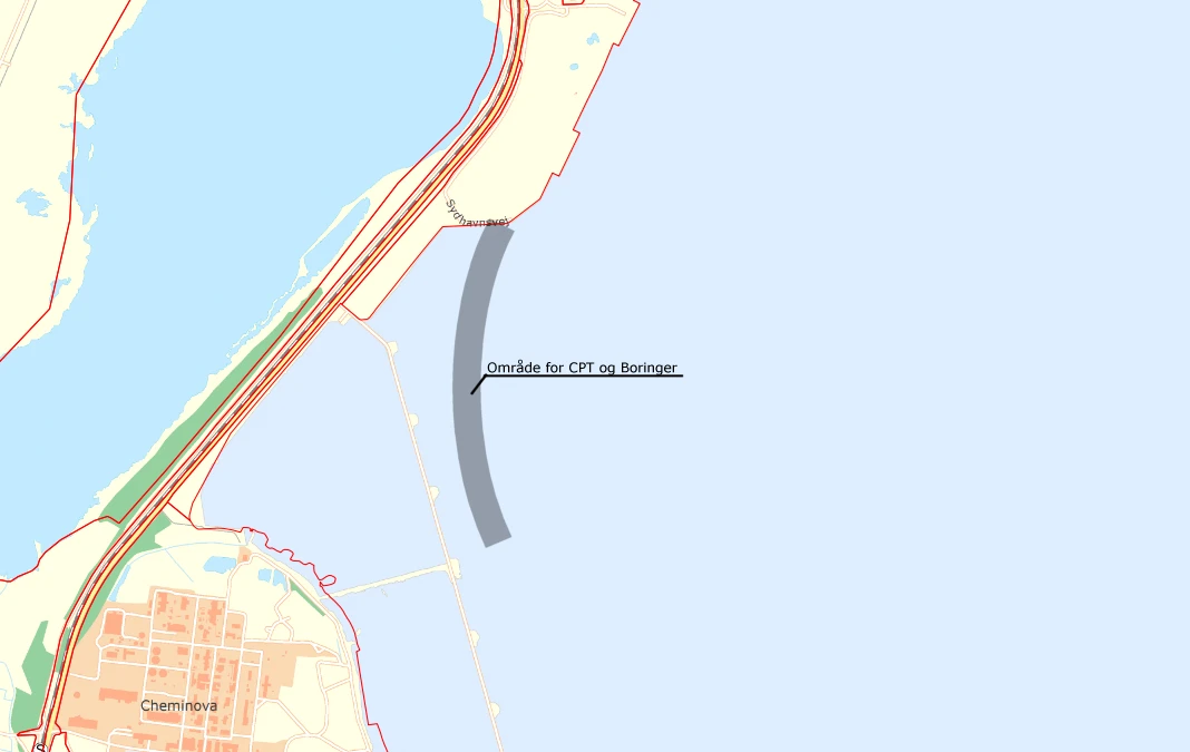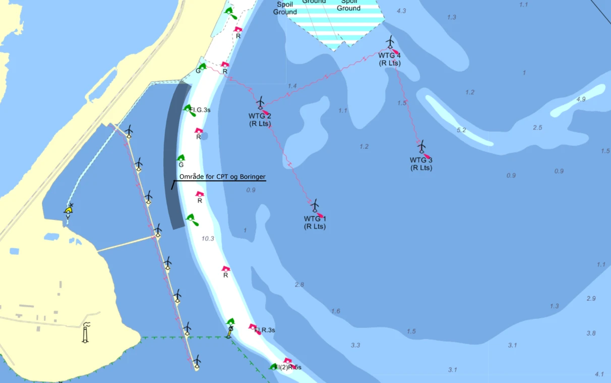 Boringer og CPT (Cone Penetration Test) udføres fra borerig på flåde med jack-up. Varigheden af de geotekniske undersøgelser anslås til 2-3 uger. Undersøgelserne forventes udført i for